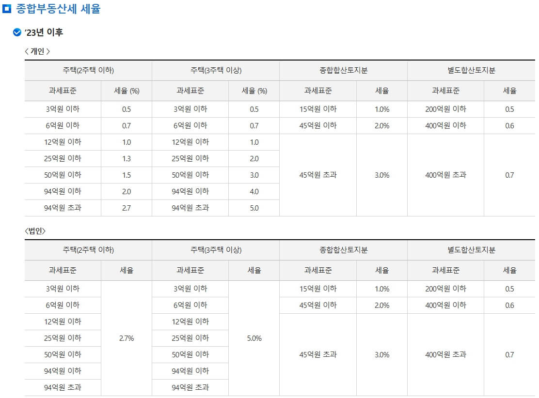- 2주택 이하 개인 : 공시가격 합산 9억 원 초과 시 과세 대상